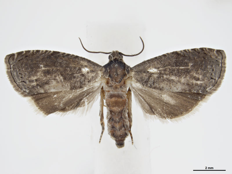 - Adult moths are brownish-grey with pale forewing patterning and 13 mm wingspan.