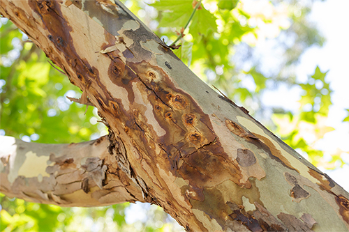 PSHB causes serious damage to many types of trees and plants with a global host list covering over 500 species. When infested, a plant can show symptoms such as dieback, shotholes, galleries, frass and gumming.
